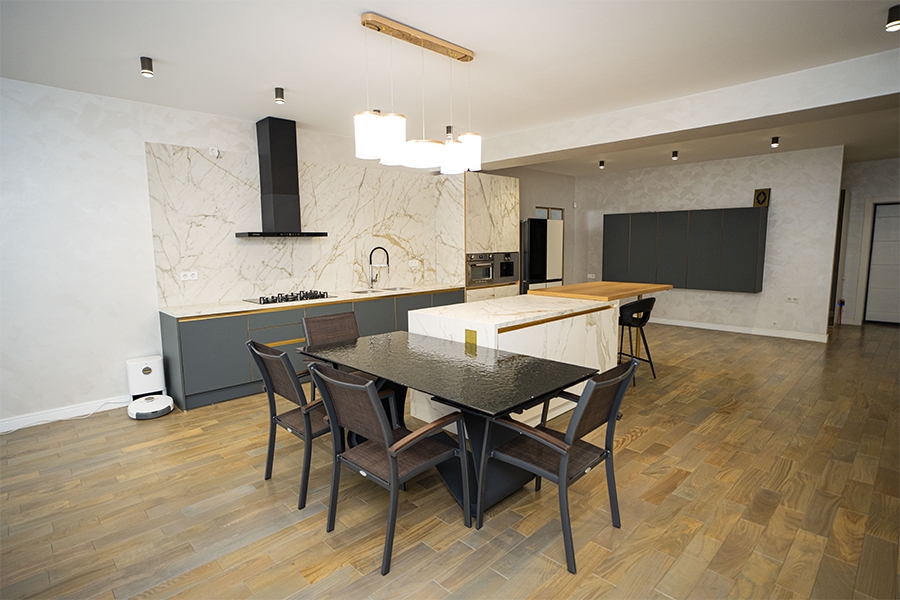 Mətbəx mebeli almaniyadan xüsusi sifarişlə gəlib. Geniş, açıq planlı məkan təmiz və səliqəli dizayn yanaşması ilə harmonik bir bütövlük yaradır. Mərkəzdə yerləşən ada həm funksional iş sahəsi, həm də sosial ünsiyyət nöqtəsi kimi çıxış edir; adaya bitişik masa hissəsi isə gündəlik istifadə üçün rahat və estetik həll təqdim edir.