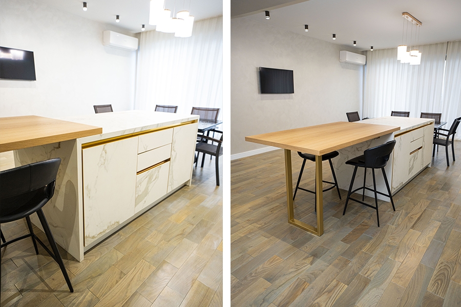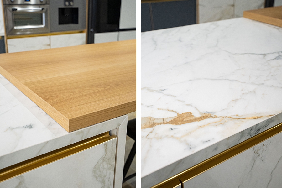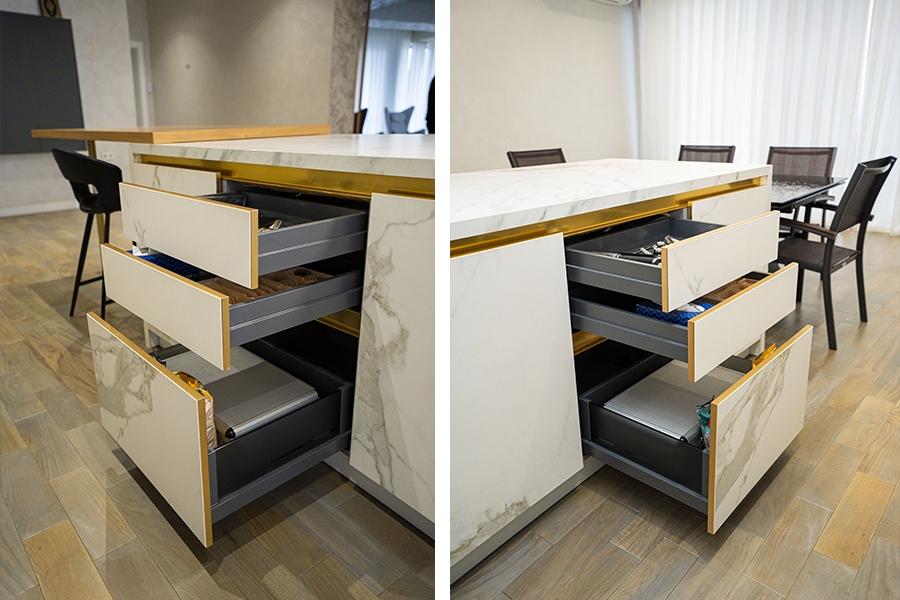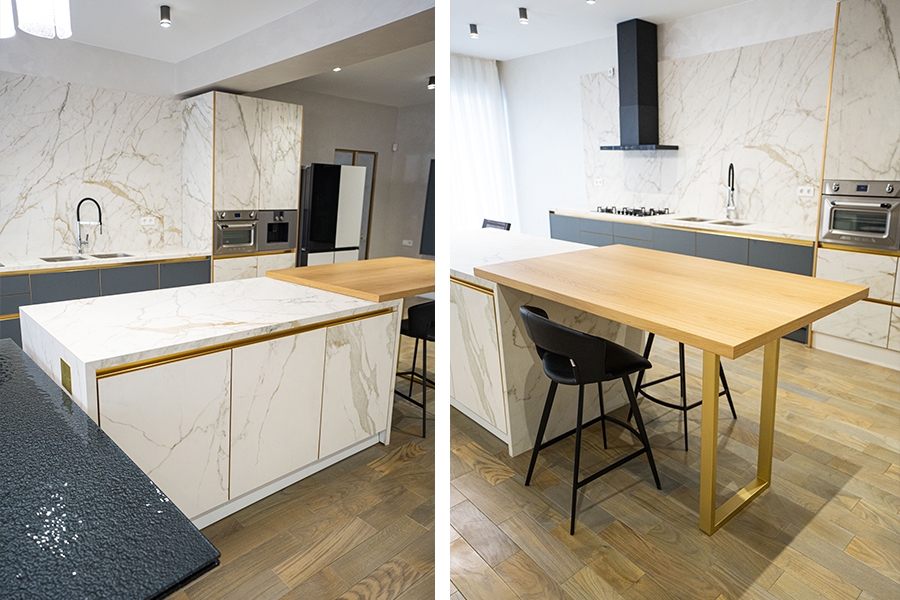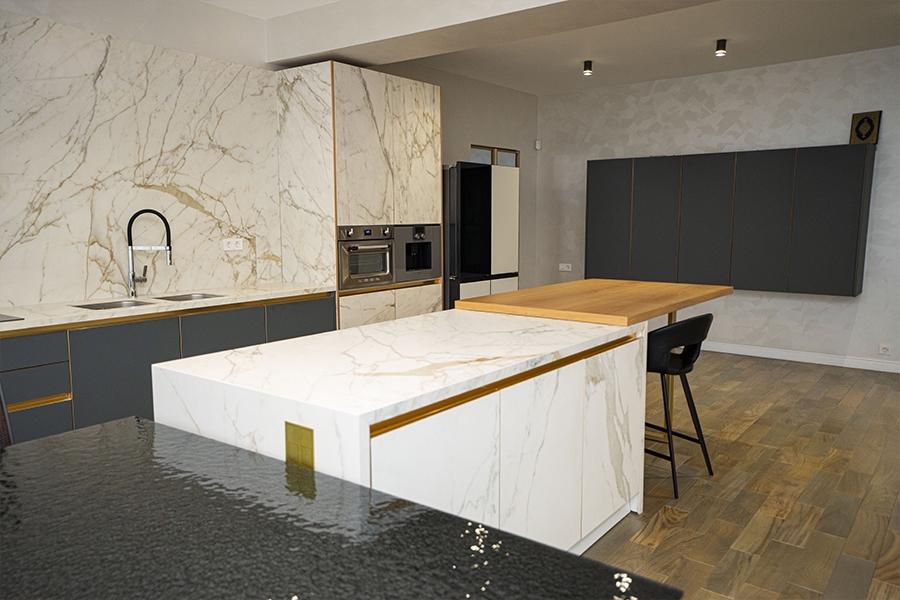 Dəzgah hissələrində isə “Miracle Stone” kolleksiyasına aid keramoqranit materialın “Diana” rəngi seçilərək həm dayanıqlılıq, həm də estetik görünüş təmin olunub. Bu material cızılmalara və istiliyə qarşı yüksək müqaviməti ilə uzunömürlü istifadə imkanı yaradır.