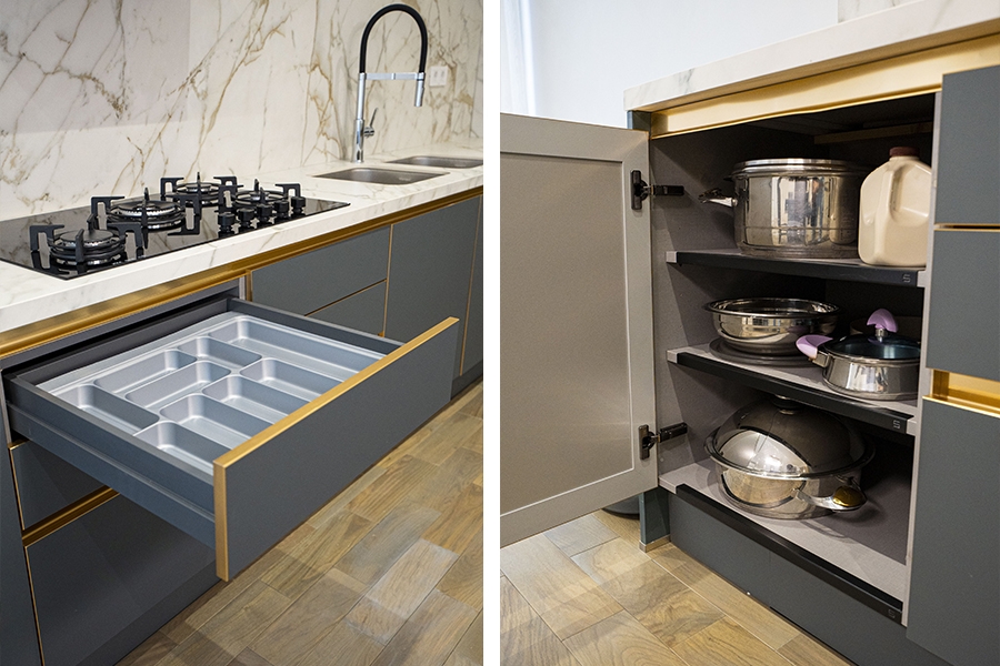 Fasadlarda istifadə olunan Fenix materialının “Verde Comodoro” rəngi mətbəxə zəriflik və dərinlik qatır, yumşaq mat səthi isə müasir minimalizmi vurğulayır.