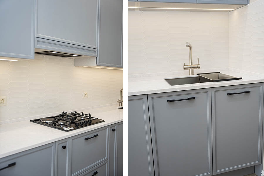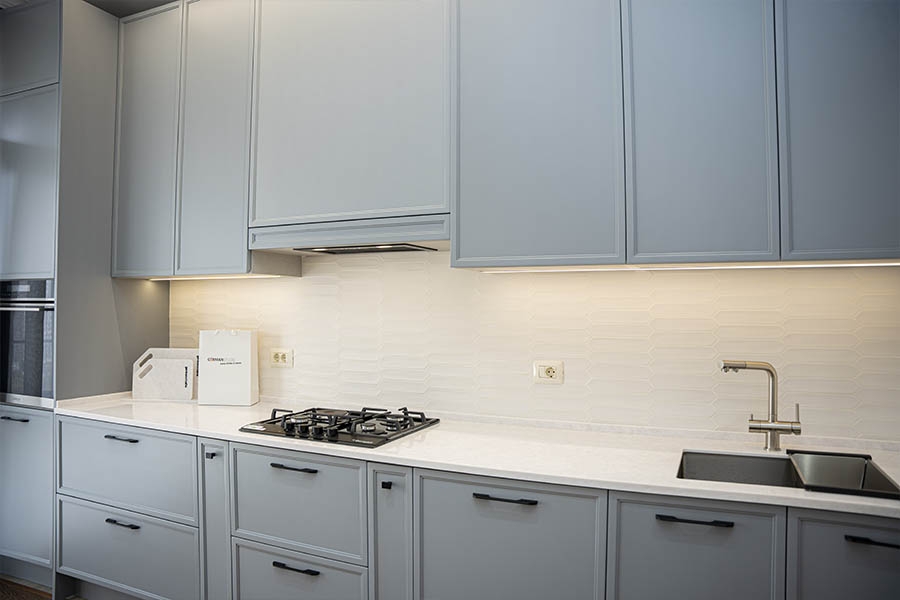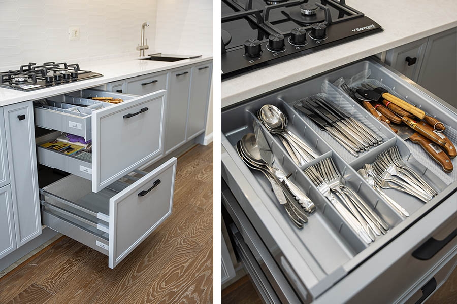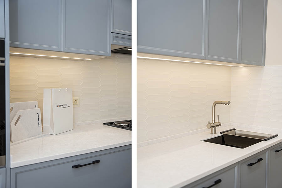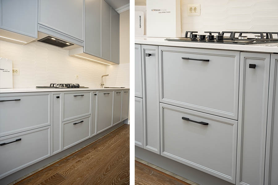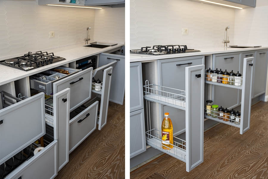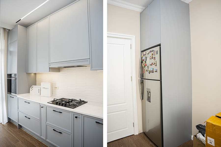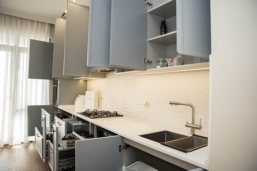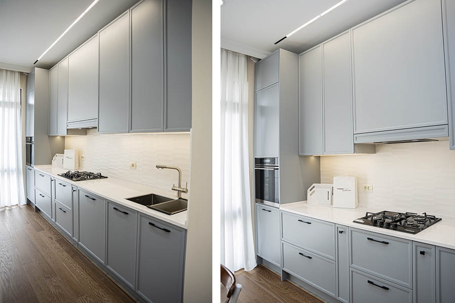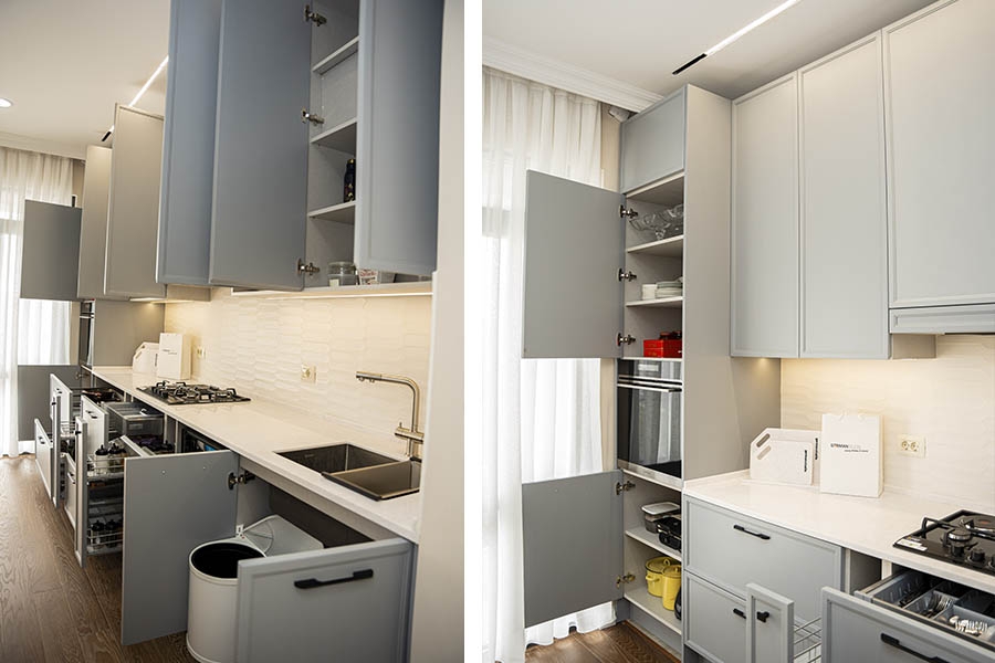 Layihədəki mətbəx mebeli “Altair” kolleksiyasından ilhamlanaraq “Spanish Gray” rəng palitrasında dizayn edilib. Sakit, zərif boz tonları mətbəxə həm müasir, həm də eleqant atmosfer qazandırır. Tavana qədər uzanan dolab konstruksiyası geniş saxlama sahəsi yaradaraq məkanı daha funksional və səliqəli istifadə etməyə imkan verir. Bütün bölmələrdə gündəlik rahatlıq nəzərə alınaraq funksional mexanizmlər tətbiq olunub.