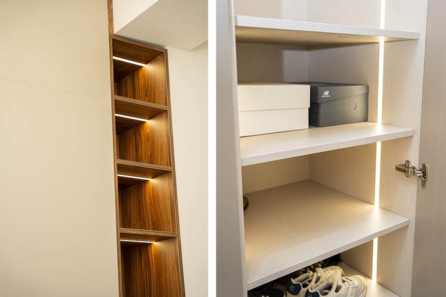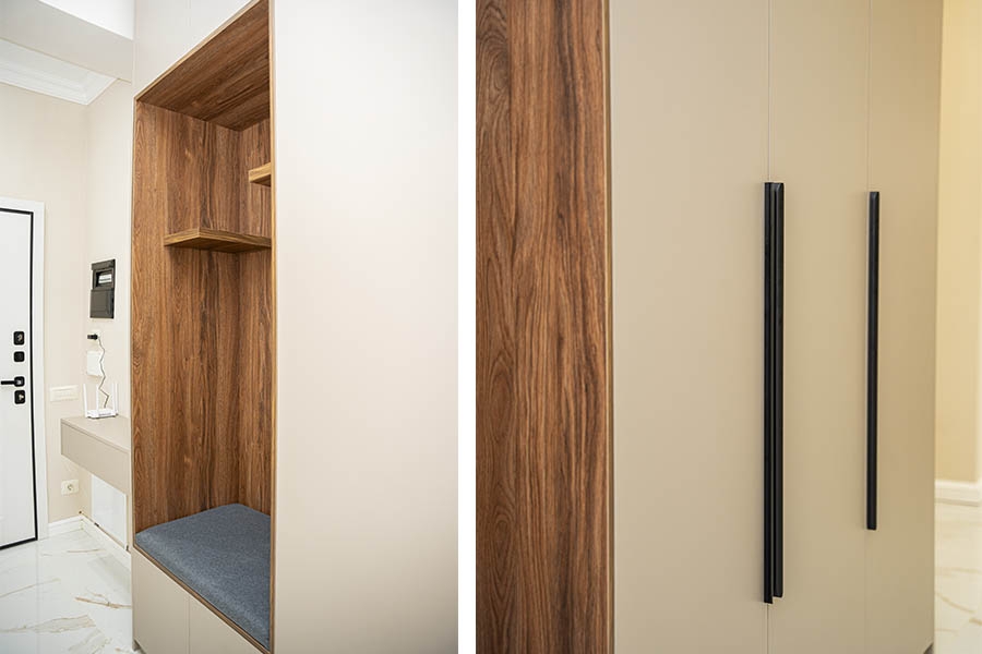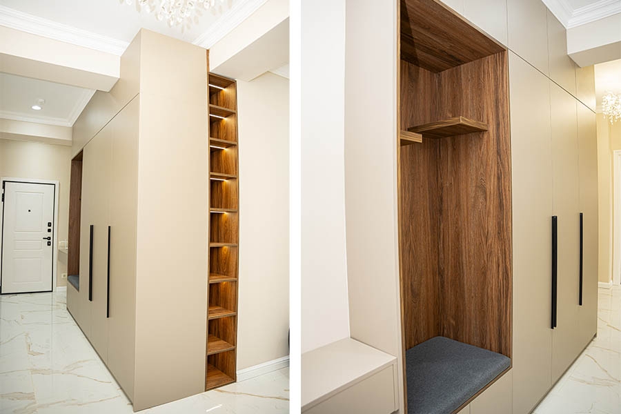Giriş zalında tavana qədər uzanan, funksional və minimalistik dəhliz mebeli dizayn etmişik. Konstruksiyada açıq rəflər, gündəlik istifadə üçün əlçatan oturma sahəsi və həm dekorativ, həm də praktik məqsəd daşıyan LED işıqlandırma sistemi quraşdırılıb.