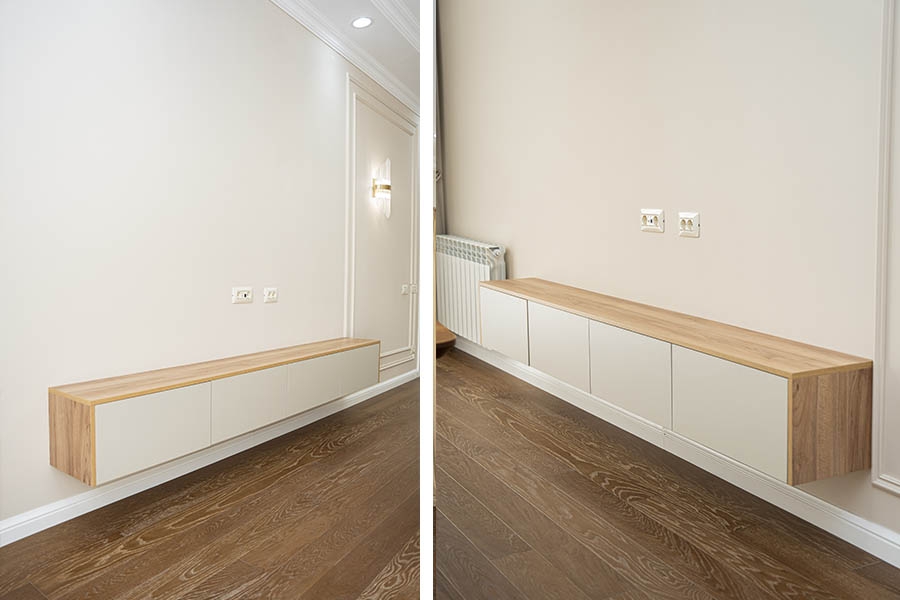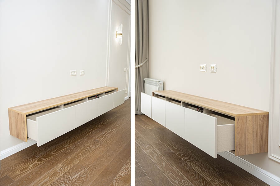 Modern üslubda dizayn etdiyimiz TV stendi ümumi dizaynla harmoniya yaradaraq, həm estetik görünüş, həm də saxlanılma üçün optimal həll təqdim edir.