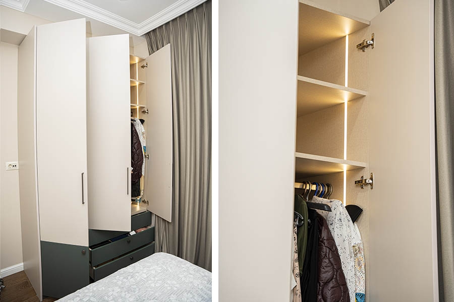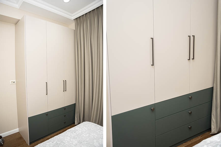 Layihənin uşaq otağı üçün nəzərdə tutulan dolabı isə kompakt ölçülü və iki rəngin harmonik sintezindən ibarətdir. Burada məkanın funksional istifadəsi əsas götürülüb: inteqrasiya olunmuş rəflər, geyim və oyuncaqlar üçün bölmələr quraşdırılıb. Rəng kombinasiya isə otağa enerjili və eyni zamanda balanslı bir atmosfer bəxş edir.