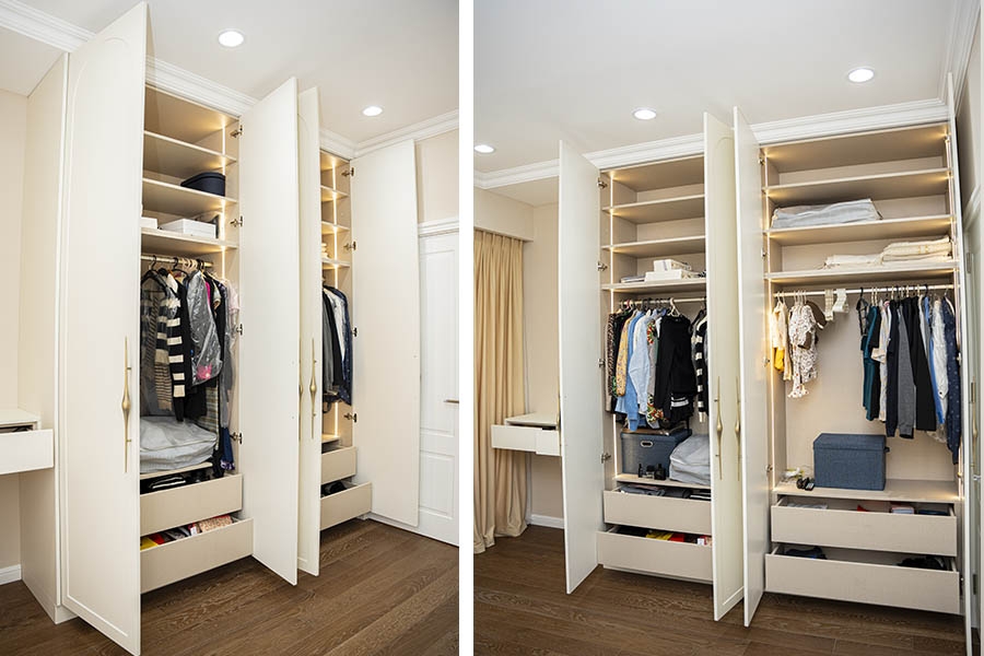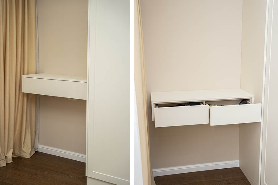 Dolabın yan hissəsində inteqrasiya olunmuş makiyaj masası layihənin həm estetik, həm də praktiki tərəfini gücləndirir.