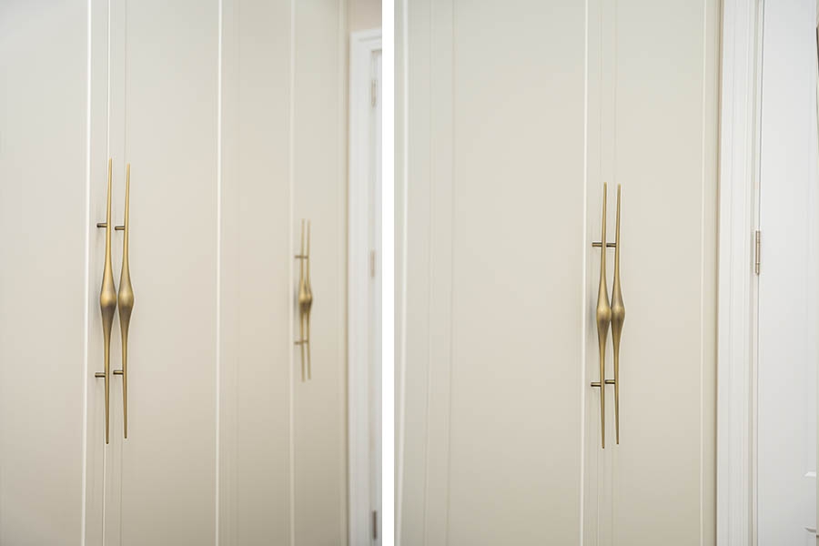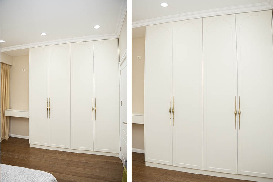 Tavanaqədər dizayn edilən dolablar həm vizual olaraq məkanı yüksəldir, həm də geniş saxlama sahəsi yaradaraq funksionallığı maksimum dərəcədə artırır. Dolabın ümumi xəttləri minimalistik və zərifdir. Seçilmiş qızılı tutacaqlar isə dizayna incə bir lüks toxunuşu əlavə edir.