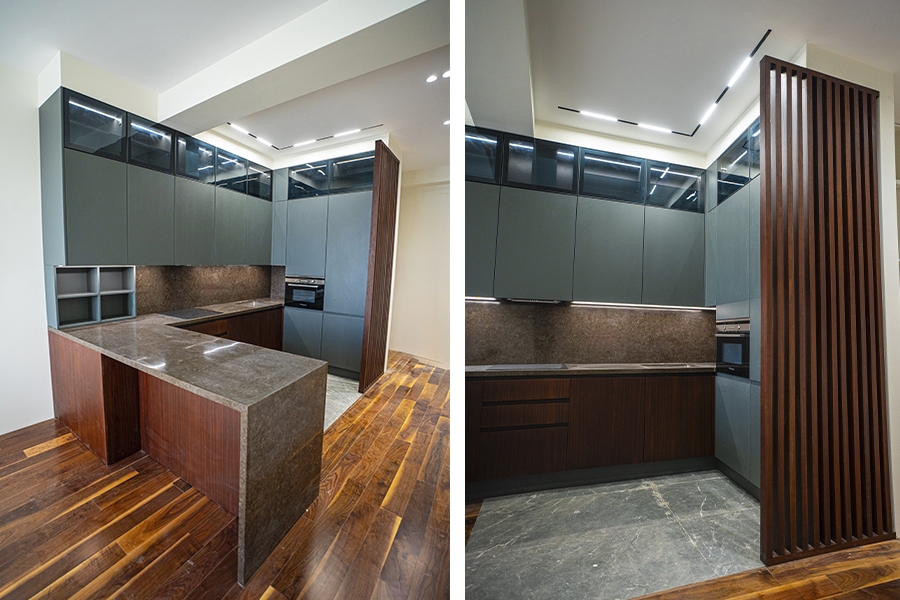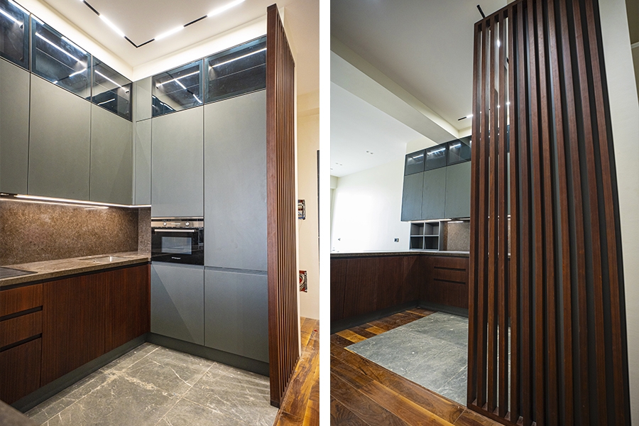 Bu layihədə təqdim olunan mətbəx mebeli "Millau" kolleksiyasına aiddir. Dizaynda xüsusi ağac fakturalı Şpon və Traffic Gray rənglərinin harmoniyası müasirlik və təbii ahəngi bir araya gətirir. Rəng keçidləri və materialların fakturalı səthi mətbəxə isti və zərif atmosfer qazandırır.