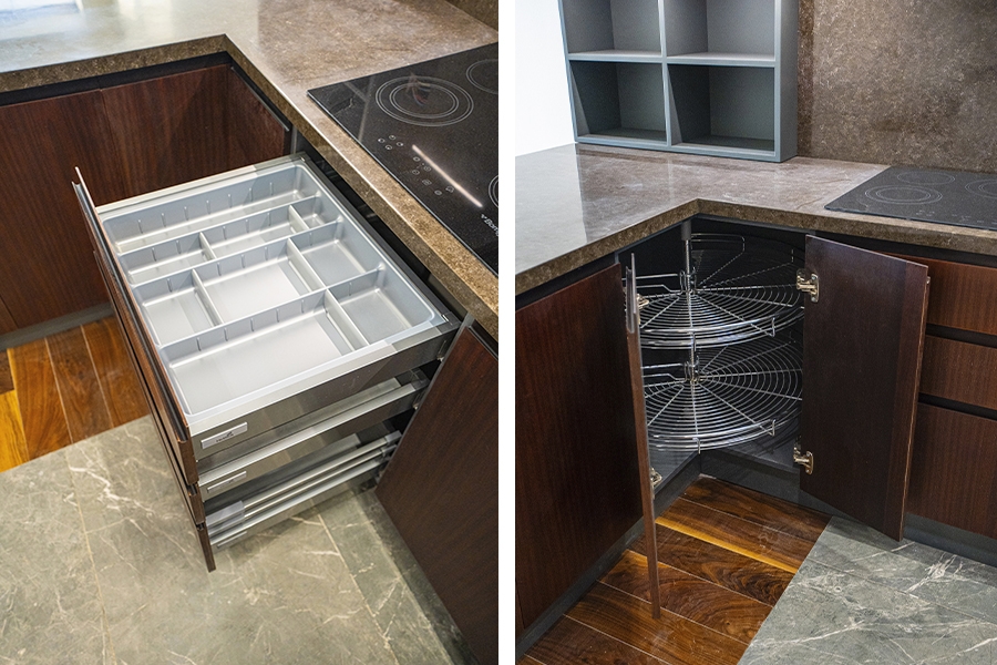 Alt künc dolab hissəsində isə karusel sistem mexanizm quraşdırılmışdır. Bu sistem sayəsində künc hissələrdəki boşluq tam şəkildə funksional hala gətirilir — rəflər fırlanaraq içəridəki əşyaların rahatlıqla əldə olunmasına imkan yaradır. Karusel mexanizmlər mətbəxdə istifadə rahatlığını artırır, həmçinin künc sahələrin maksimal səmərə ilə istifadəsini təmin edir.