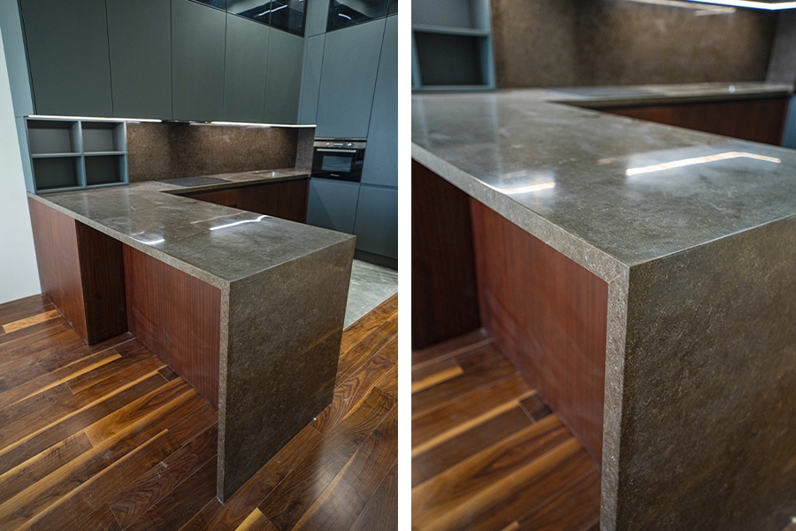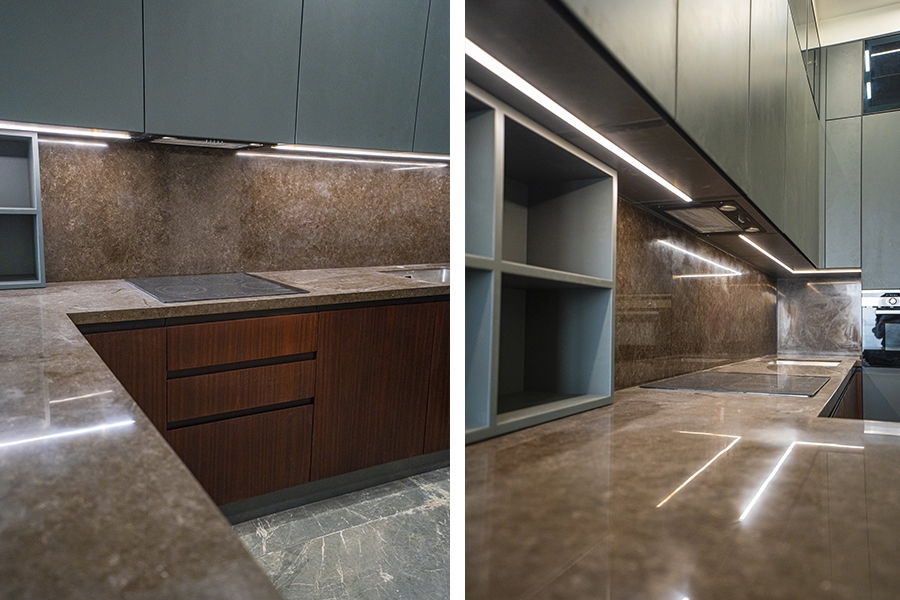 Dəzgah səthi isə "Miracle Stone" kolleksiyasının akrilik seriyasına daxil olan “Brown Nebula” rəngidir. Bu akrilik daş yüksək davamlılığı, su və ləkə keçirməzliyi, ilə həm estetik, həm də funksional baxımdan ideal seçimdir.