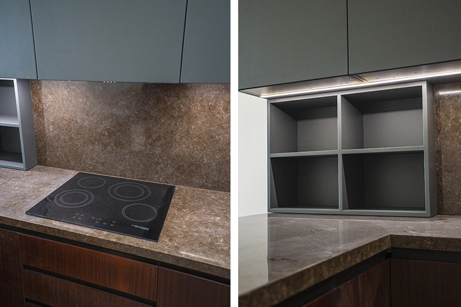 Üst hissədə yerləşən şüşəli, LED işıqlı dolablar sayəsində həm vizual effekt yaradılır, həm də saxlama sahələri işıqlanaraq mətbəxə əlavə parlaqlıq bəxş edir.