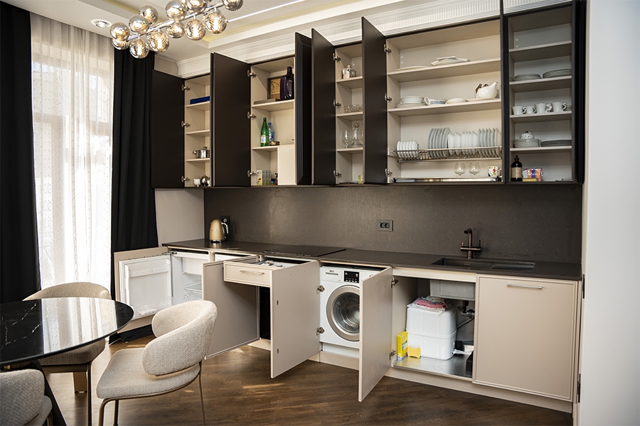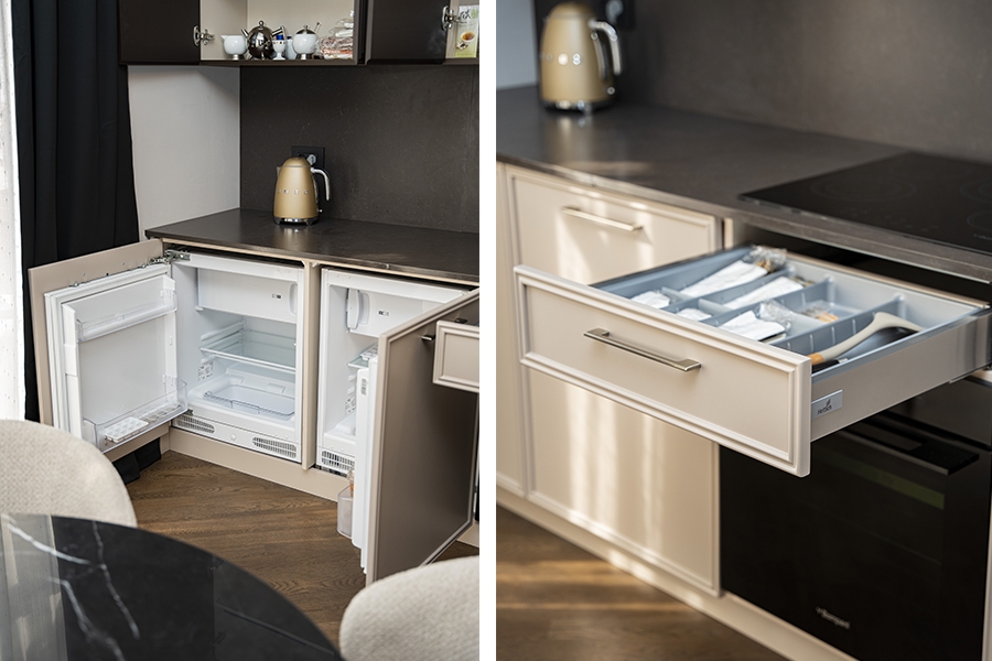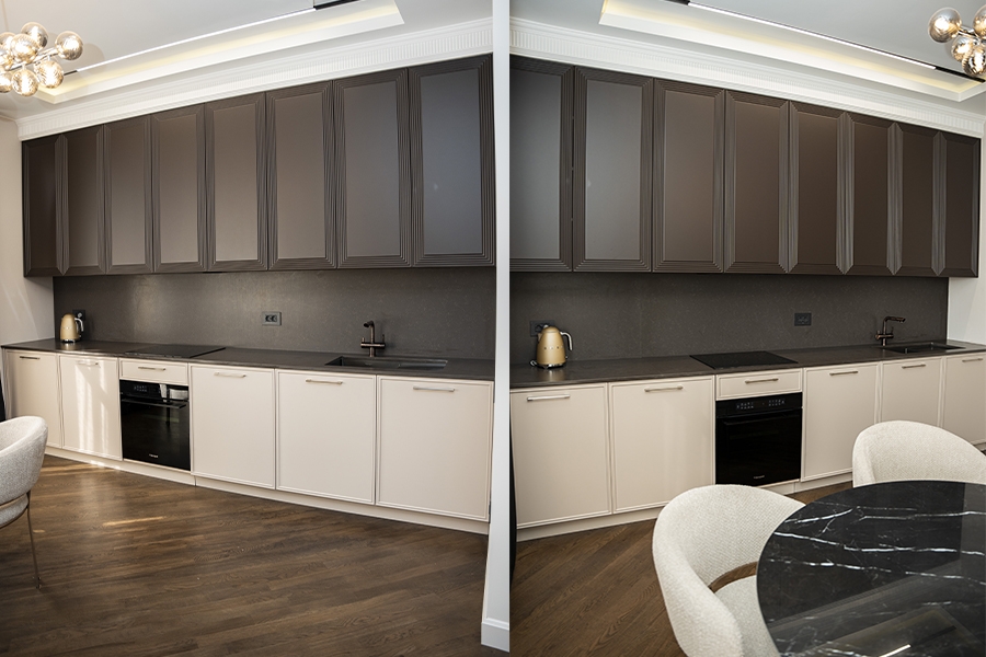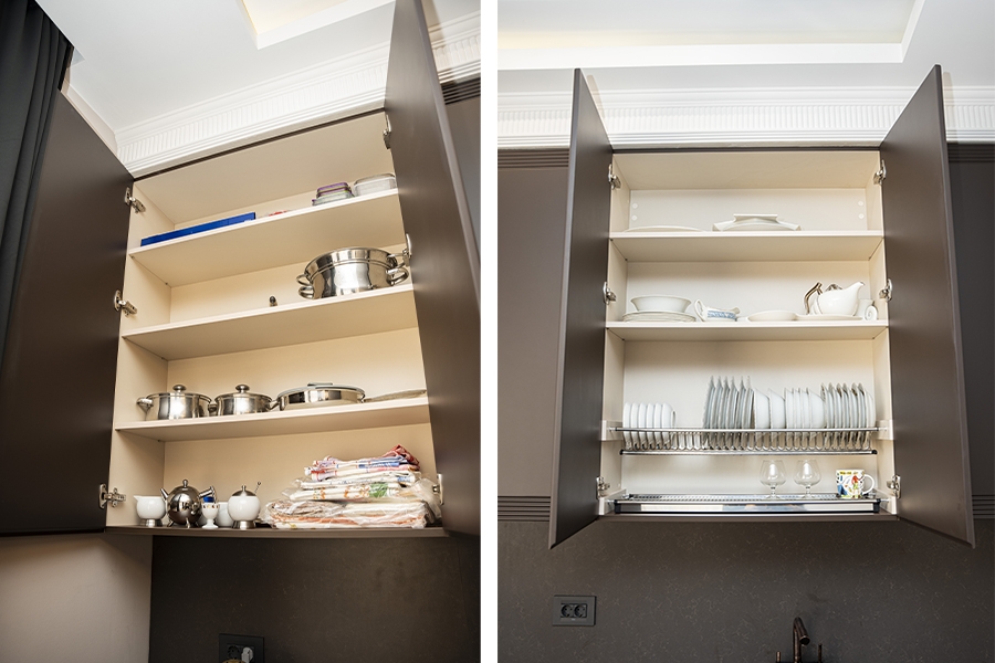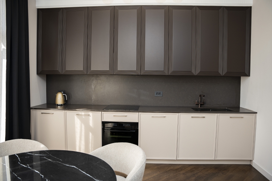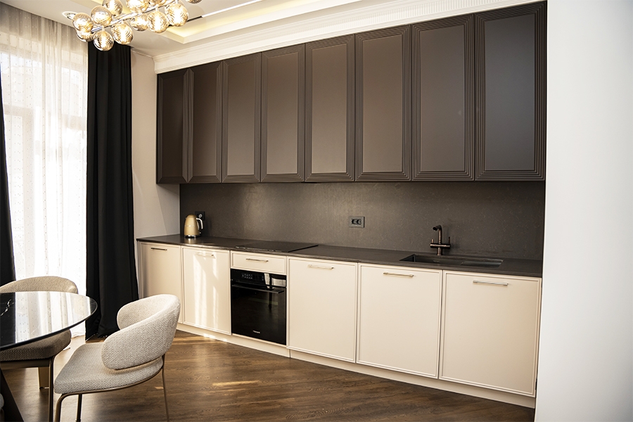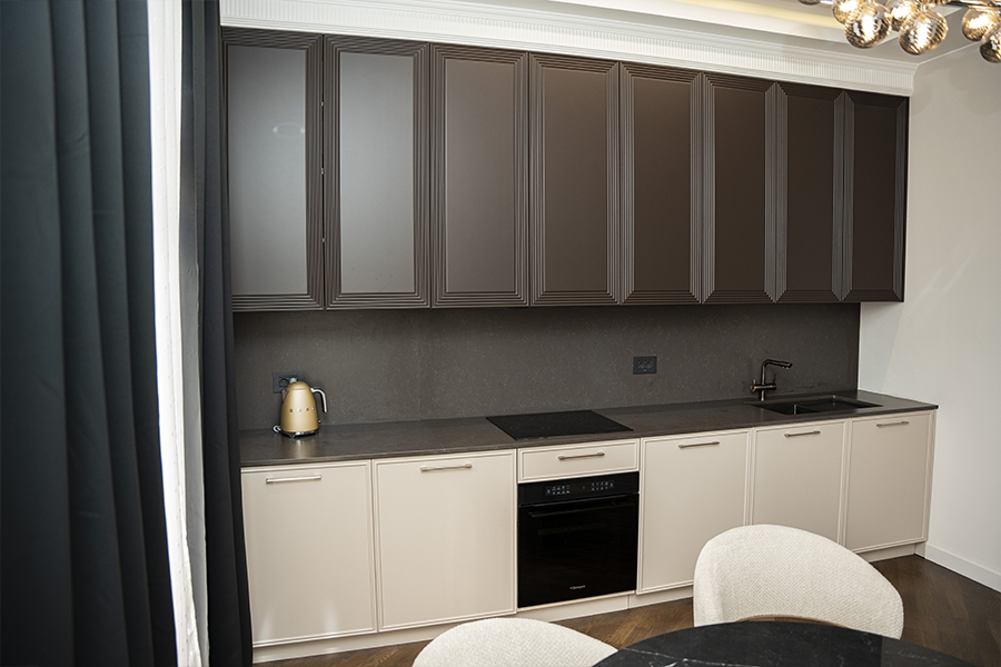 Tavana qədər uzanan, tünd və açıq tonların harmonik sintezində dizayn edilən bu mətbəx mebeli neoklassik üslubun incəliklərini özündə birləşdirir.