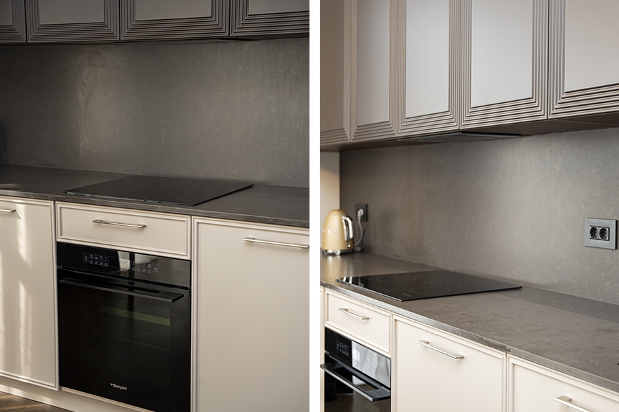 Dəzgah səthi isə davamlılığı və eleqant görünüşü ilə seçilən “Miracle Stone” kolleksiyasına məxsus kvars materialından hazırlanıb. Bu seçim həm gündəlik istifadəyə uyğunluq, həm də uzunömürlülük baxımından ideal həll sayılır.