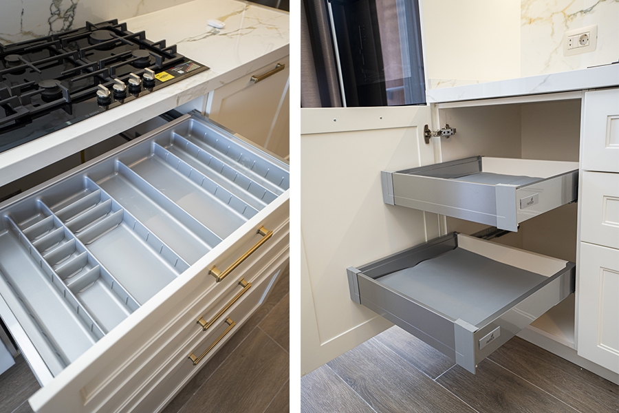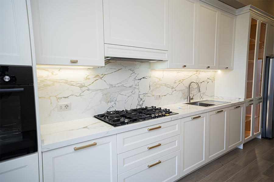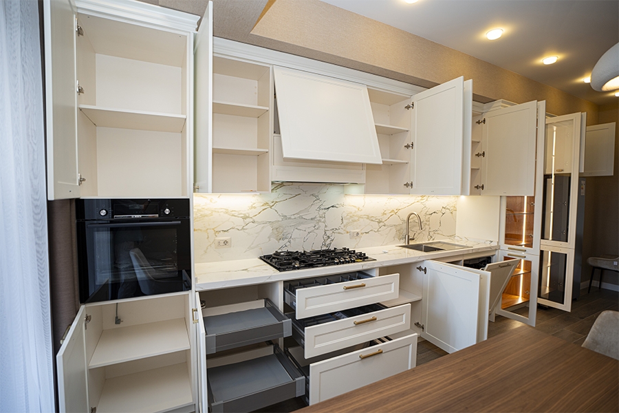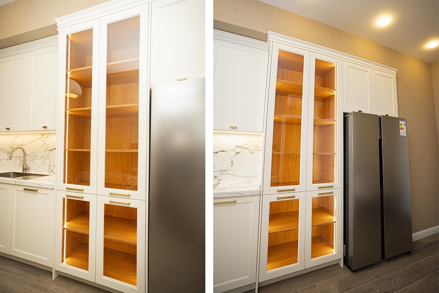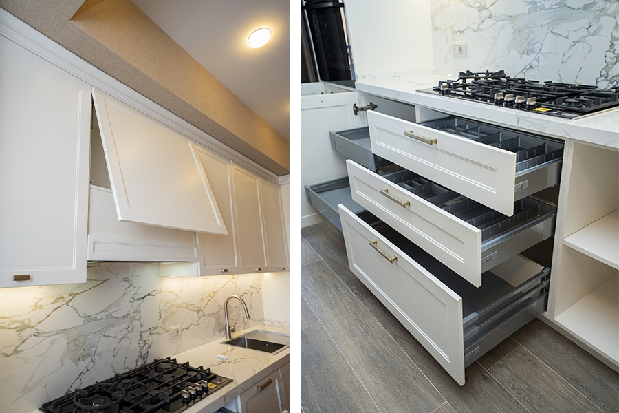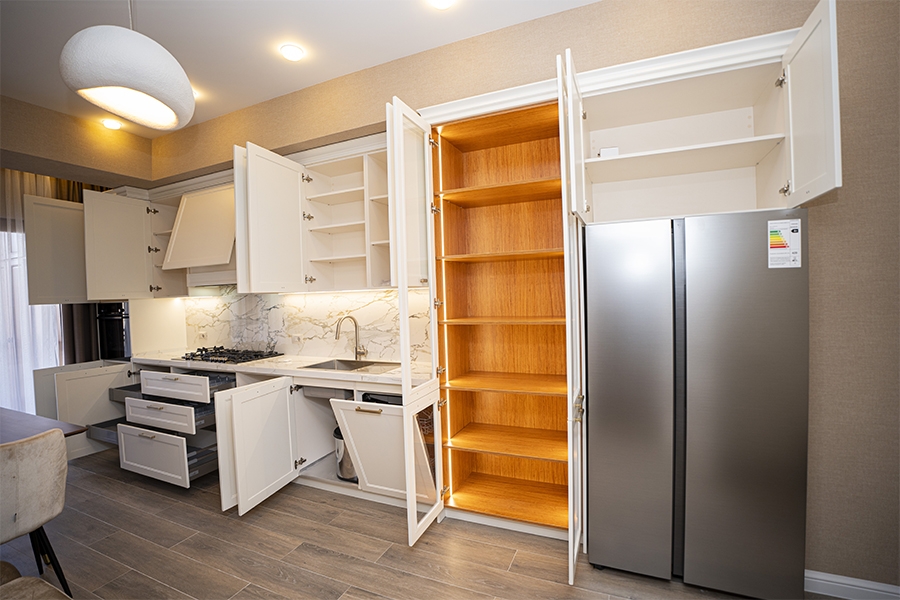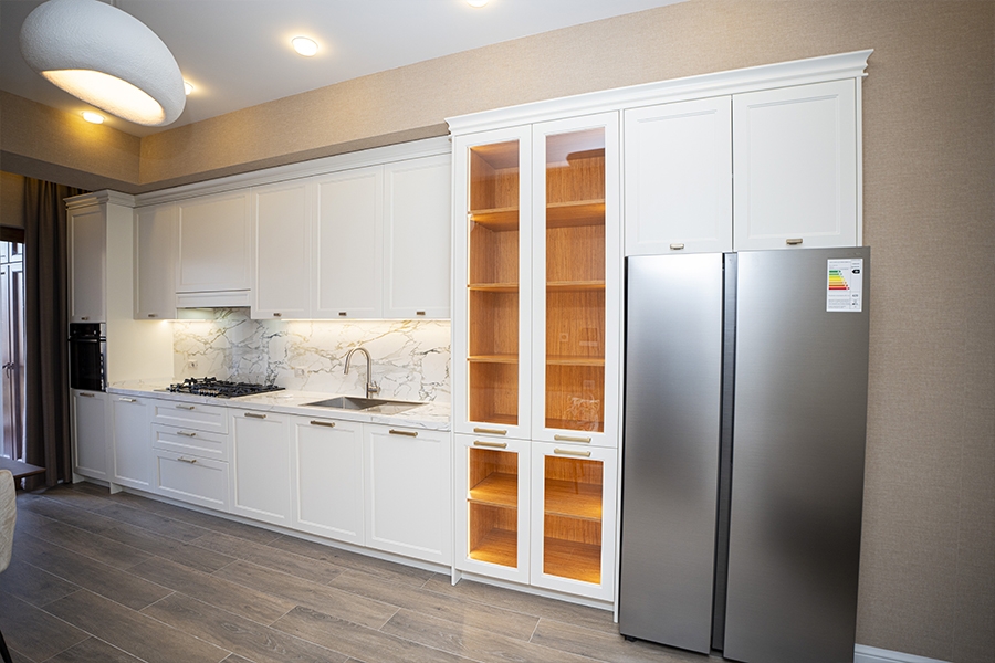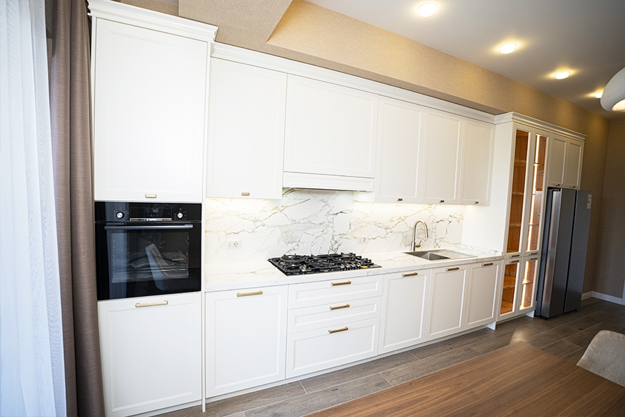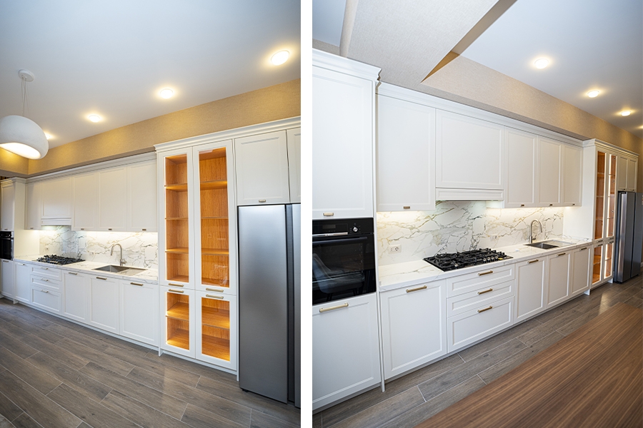 Neoklassik üslubun klassik detalları ilə müasir dizayn elementlərinin vəhdətində yaradılmış bu mətbəx, funksionallıqla yanaşı yüksək estetik dəyərlərə də cavab verir.