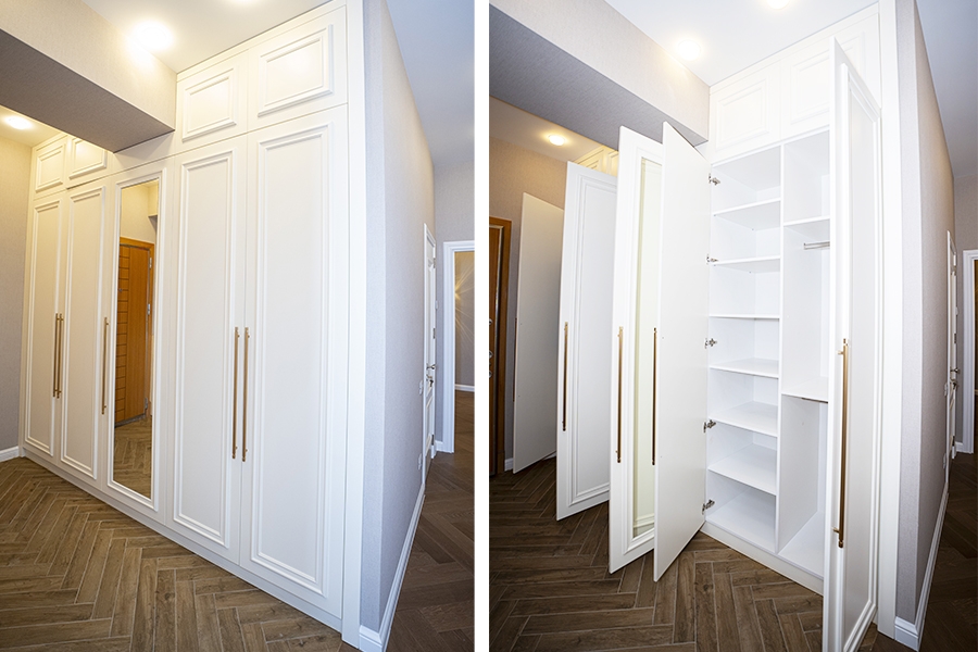 Ağ rəngdə, tavana qədər uzanan, qızılı tutacaqlı bu neoklassik dəhliz mebeli həm zərif görünüşü, həm də geniş iç həcmi ilə seçilir. Klassik və müasir üslubun vəhdətini daşıyan dizaynı ilə interyerə incəlik qatır, eyni zamanda gündəlik ehtiyaclar üçün funksional saxlama imkanı yaradır.