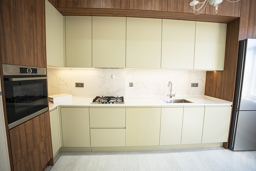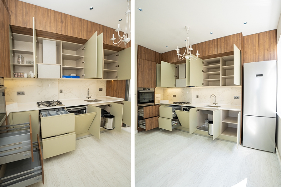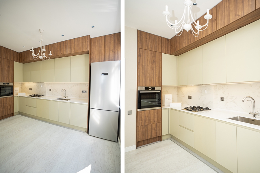 Təhvil verdiyimiz bu mətbəx mebeli, tavanadək uzanan eleqant dizaynı və müasir üslubu ilə həm funksionallığı, həm də estetik görünüşü bir araya gətirir. Açıq tonların saflığı ilə taxta teksturasının təbiiliyi harmonik şəkildə sintez olunaraq interyerə isti və zərif bir ab-hava qatıb.
